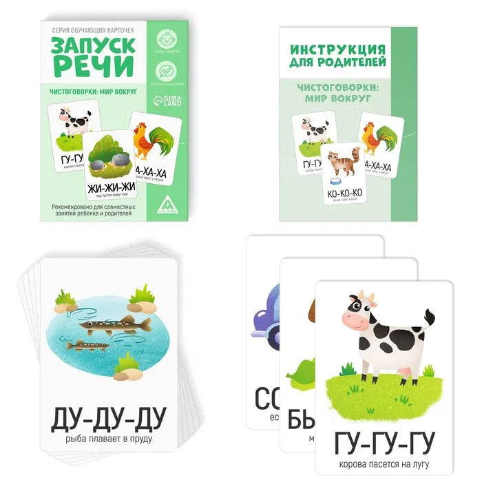 В наборе обучающих карточек для развития речи малыша ждут забавные картинки и мини-стишки. Занятия с ними научат ребёнка произносить сложные звуки, чувствовать ритм, а также позволят интересно провести время с родителями. С этими карточками малыш сможет улучшить своё произношение и избежать логопедических проблем.