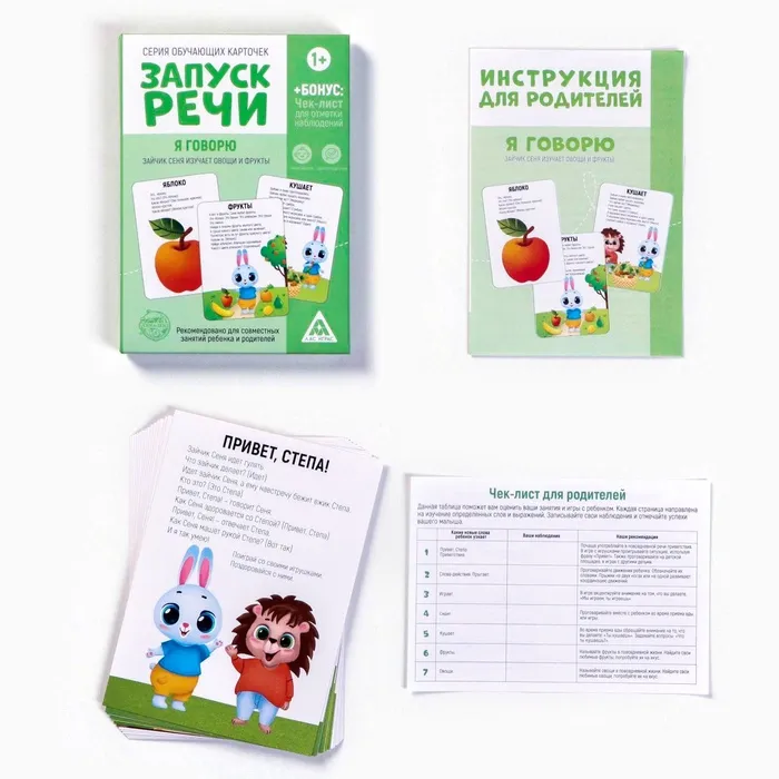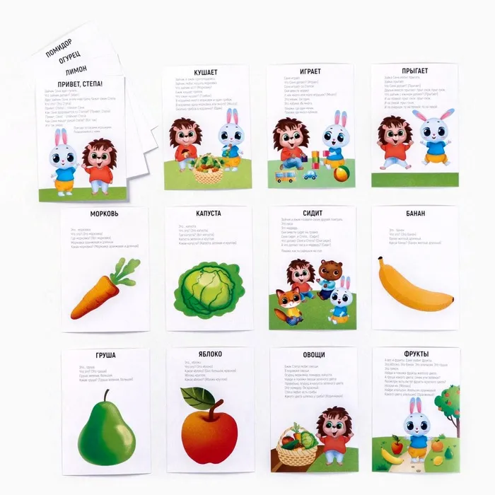 Обучающие карточки «Запуск речи. Я говорю. Зайчик Сеня изучает овощи и фрукты», 15 карточек А6 — Характеристики