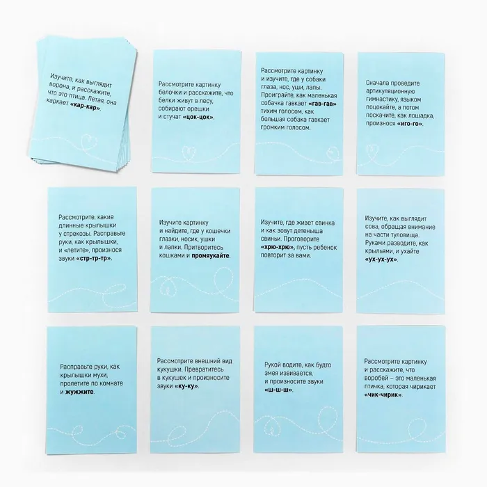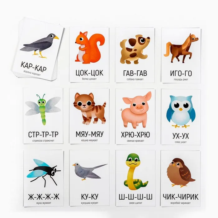 Занятия с набором обучающих карточек помогут научить ребёнка произносить сложные звуки, чувствовать ритм, а также позволят интересно провести время с родителями. Малыш узнает, какие звуки издают те или иные животные, и даже попробует повторить эти звуки сам. На одной стороне карточки нарисовано животное и звук, который он издаёт. На другой стороне — сопроводительный текст для взрослого.