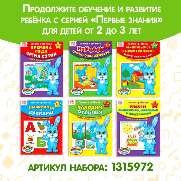 Серия обучающих книг «Первые знания» — это комплексная система занятий с ребёнком. Она делится на три возрастных периода: от рождения до 1 года, от 1 года до 2 лет, от 2 до 3 лет.
