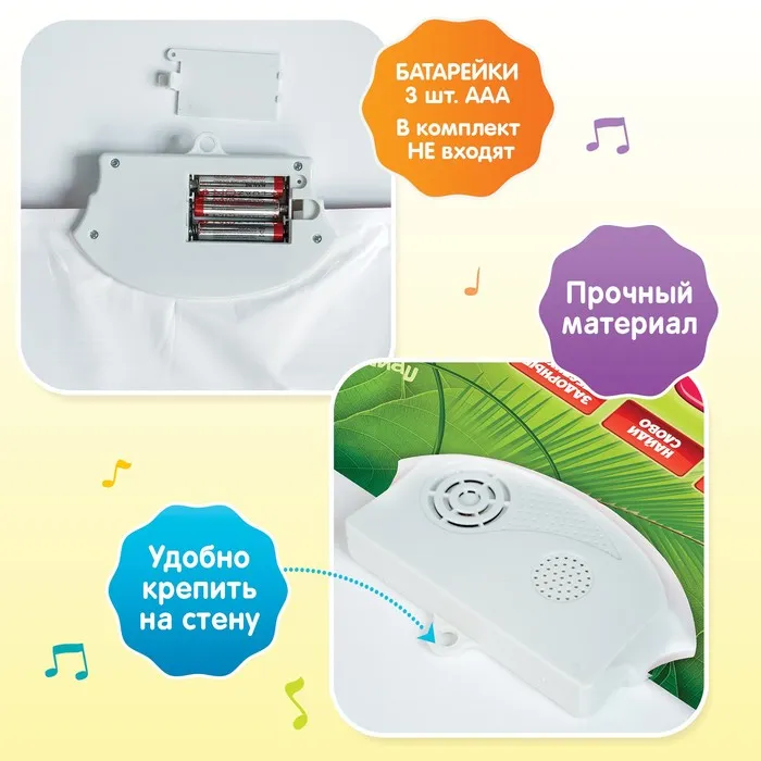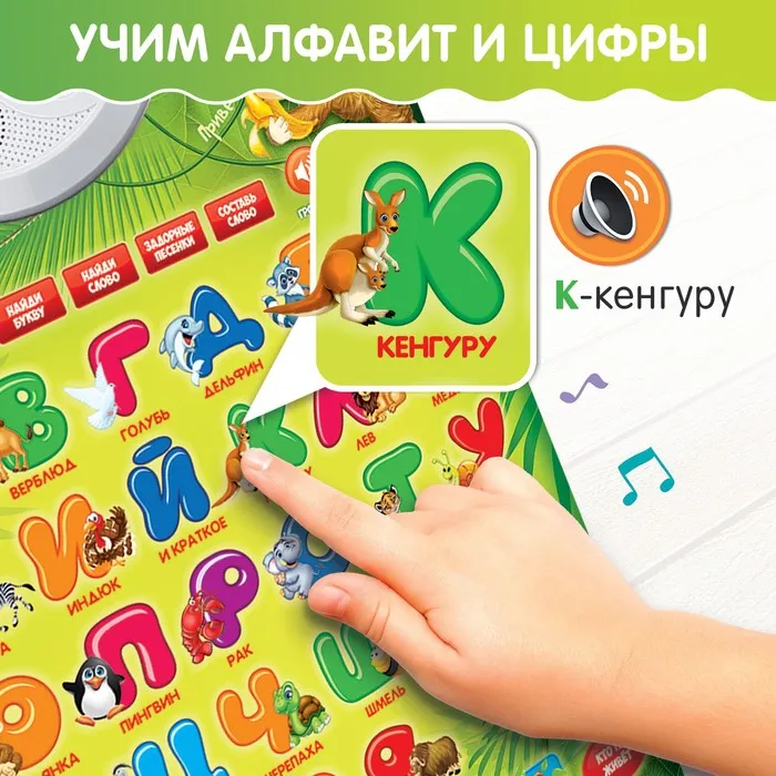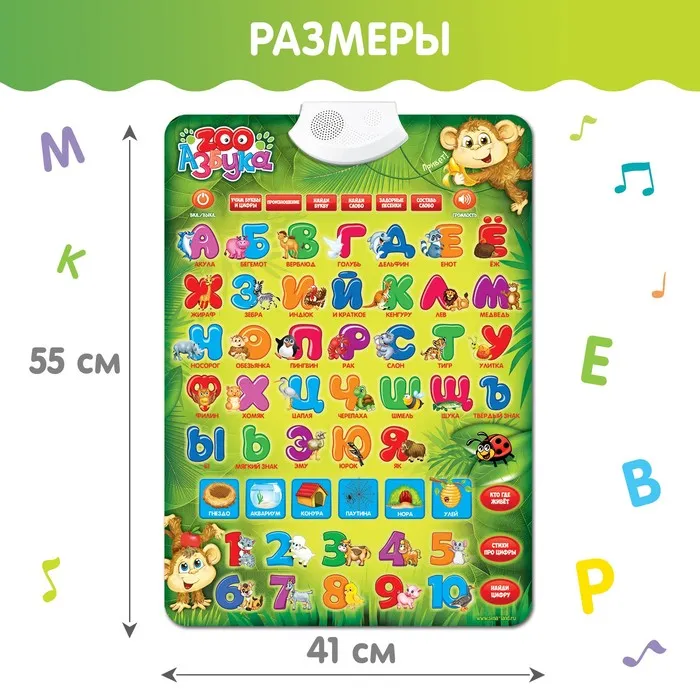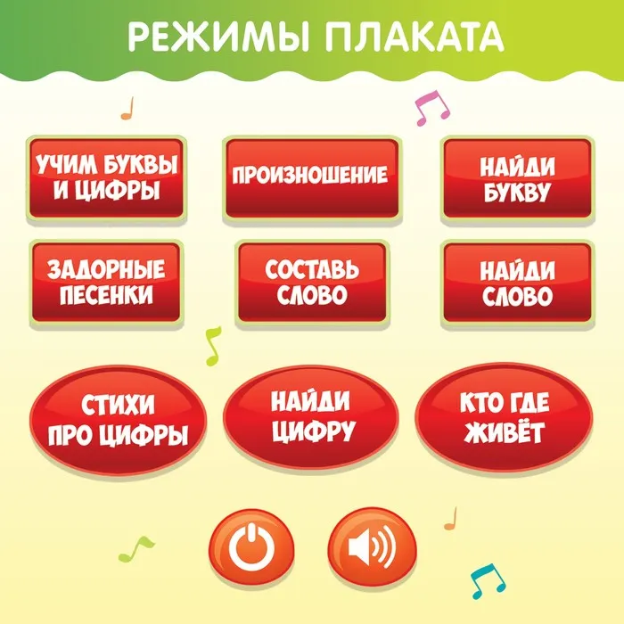 У плаката есть обучающие, музыкальные и игровые кнопки, кнопки включения/выключения и регулировки громкости, 10 кнопок с цифрами, 33 с буквами русского алфавита, а также кнопки с интересными заданиями.