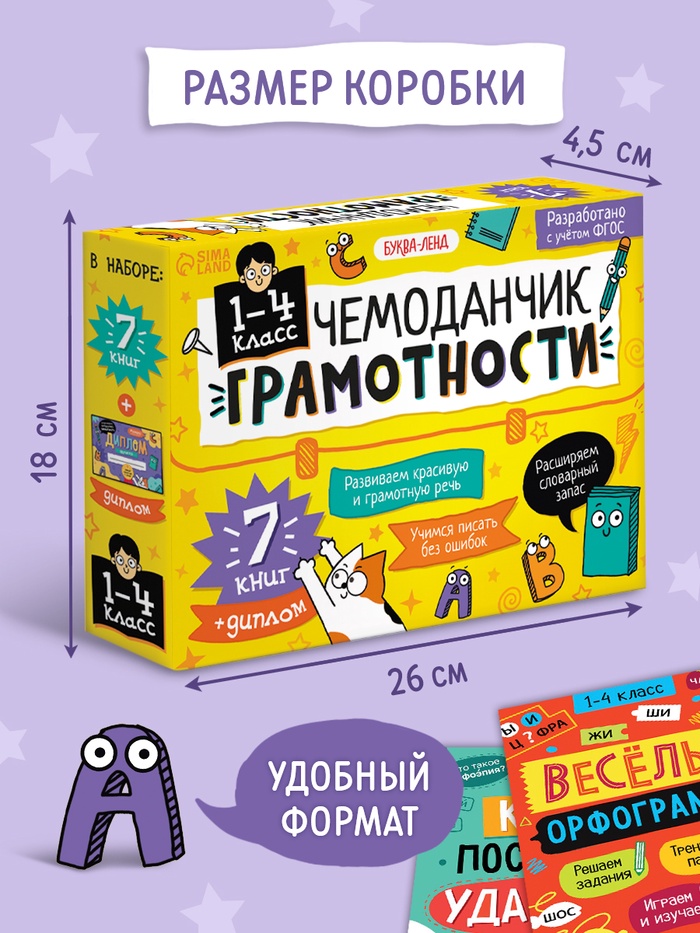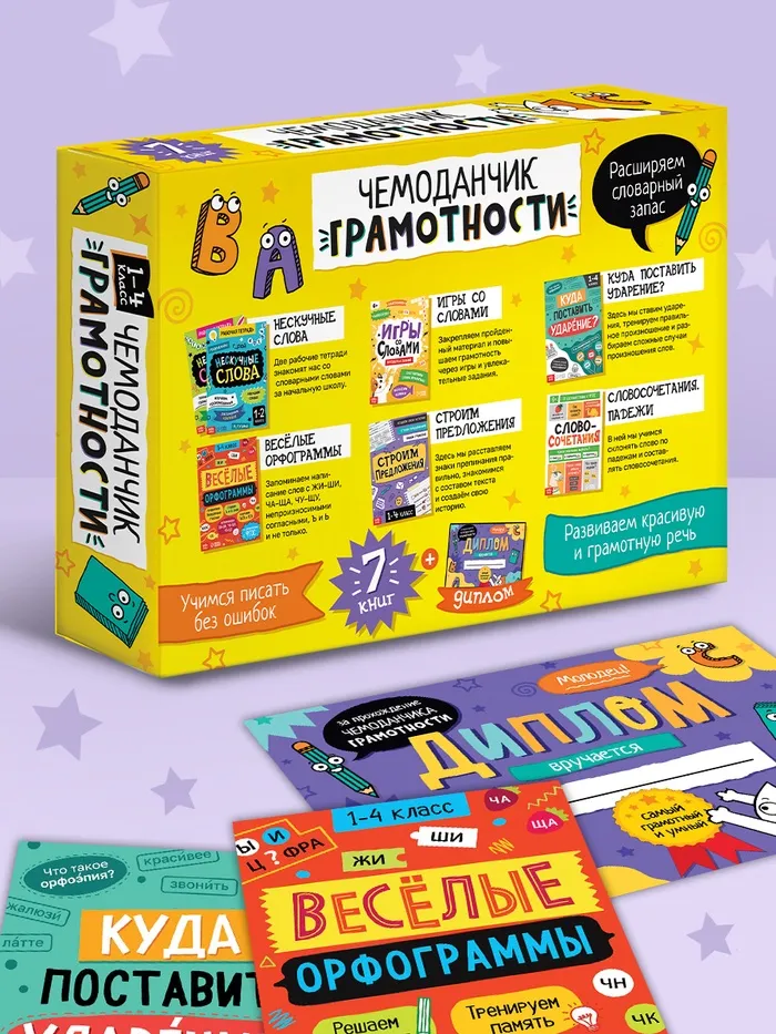 Набор «Чемоданчик грамотности» — это увлекательный и полезный подарок для детей, которые готовятся к школе или хотят улучшить свои знания русского языка. В комплекте вы найдёте 7 книг, которые помогут ребёнку освоить орфограммы, научиться строить предложения, правильно ставить ударения и работать со словосочетаниями. Обучение проходит в игровой форме, что делает процесс интересным и лёгким.