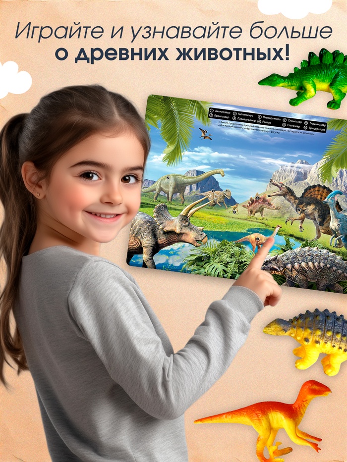 Обучающий набор «Эра динозавров» разработан для детей от 3 лет. Он познакомит малыша с вымершими животными и интересными фактами о них. Маленькие фигурки динозавров превратят процесс обучения в увлекательную игру. Разыграйте весёлые сценки, обязательно используя имена динозавров для лучшего закрепления пройденного материала.