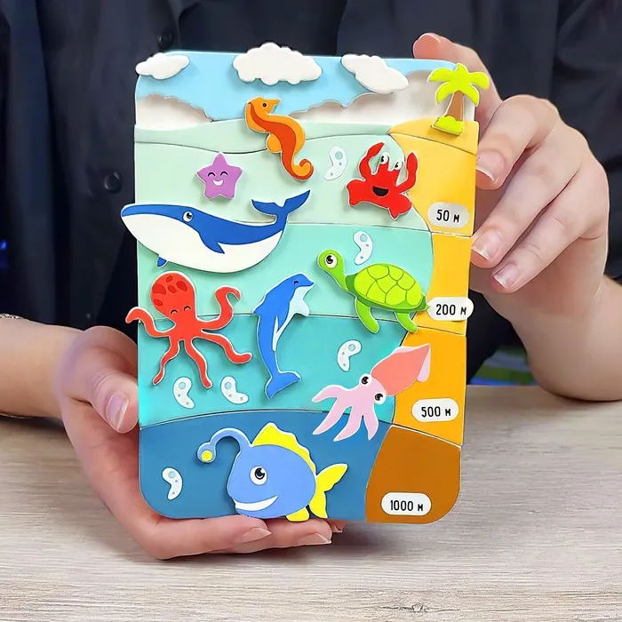 В процессе работы с набором малыш познакомится с морскими обитателями. А обучающий материал расскажет, на какой глубине они живут.