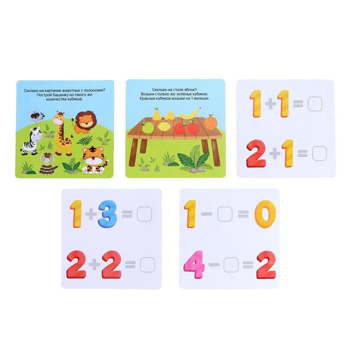Обучающий набор «Кубики-конструктор: Учимся считать» — это 20 развивающих арифметических задачек для вашего маленького гения. А решить их нужно с помощью волшебных кубиков!