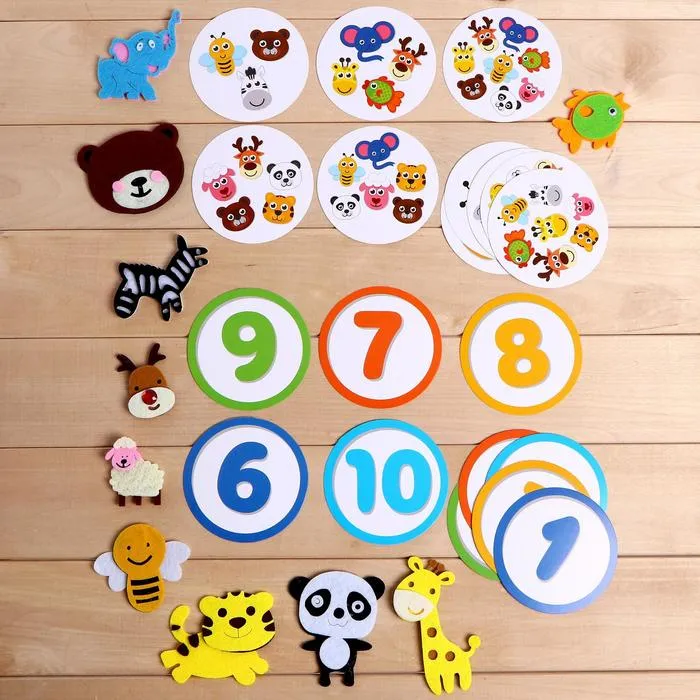 - Используйте набор в математических занятиях с малышом, изучайте счёт и решайте задачки. Пусть ребёнок подберёт к каждой цифре соответствующее количество фигурок из фетра.
