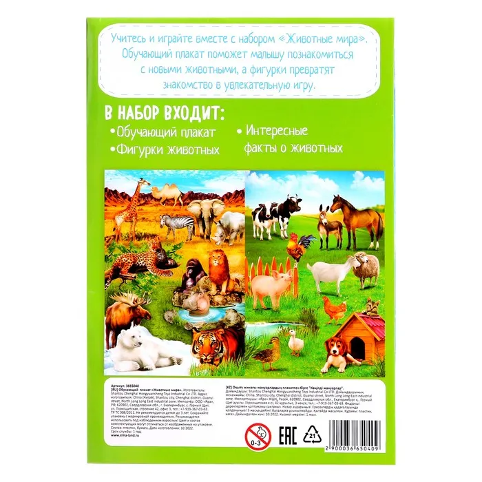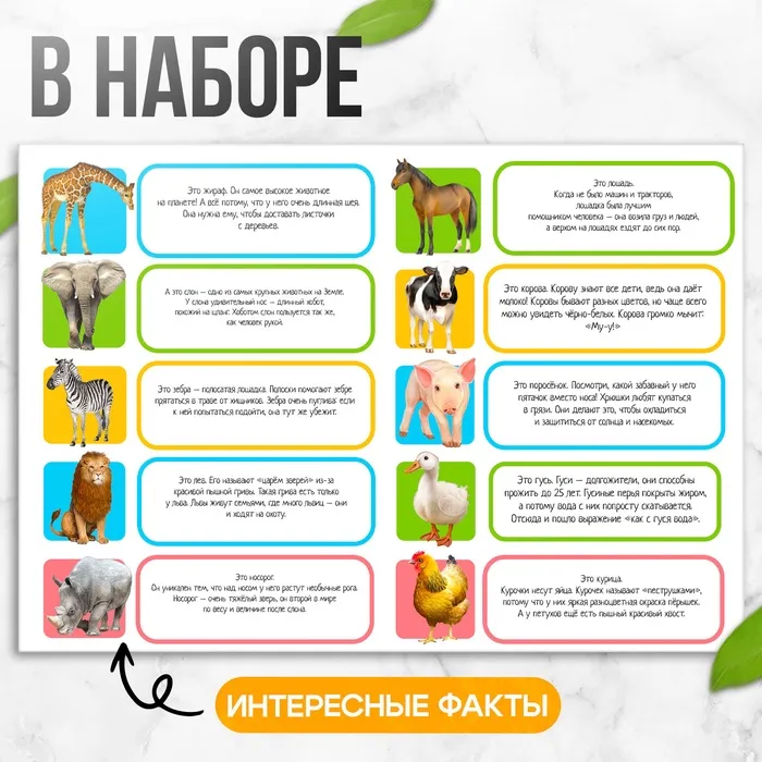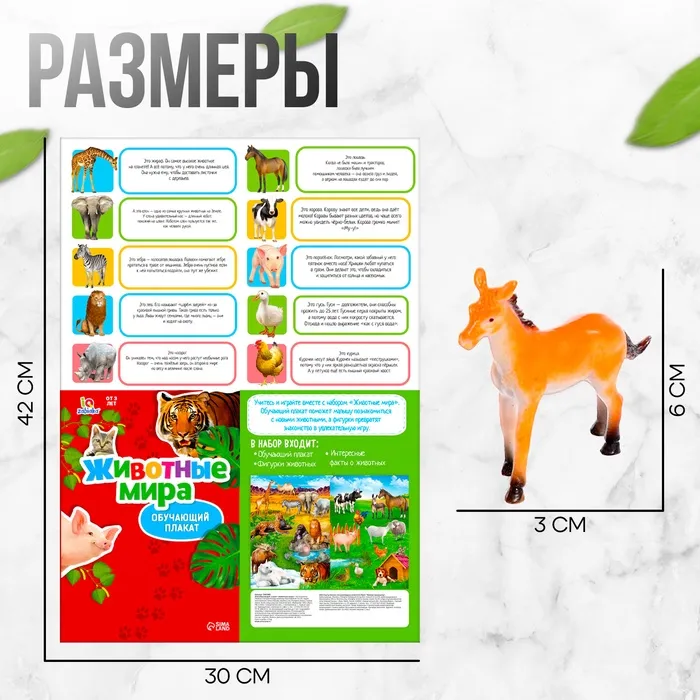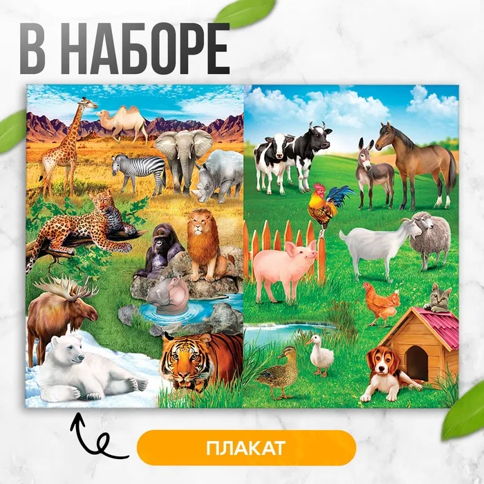 «Весёлые животные» — развивающий набор для детей от 3 лет. Такое развлечение расширит кругозор и улучшит память у малышей. С обучающим плакатом ребёнок выучит названия всех зверушек и узнает забавные факты о них.