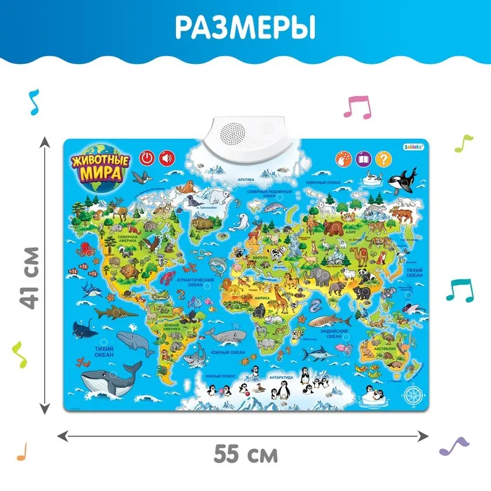 Карта с животными мира покажет ребёнку, кто и где обитает, а также расскажет интересные факты про зверей.