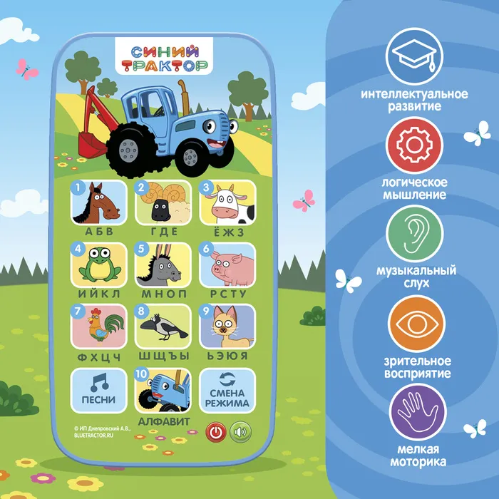 Игрушка не только развлекает, но и развивает. С её помощью ребёнок учится запоминать цифры, учит алфавит, развивает слуховое восприятие и улучшает мелкую моторику. Яркий дизайн с изображением Синего трактора делает процесс обучения ещё увлекательнее. Телефон станет верным спутником малыша в играх и первых уроках.