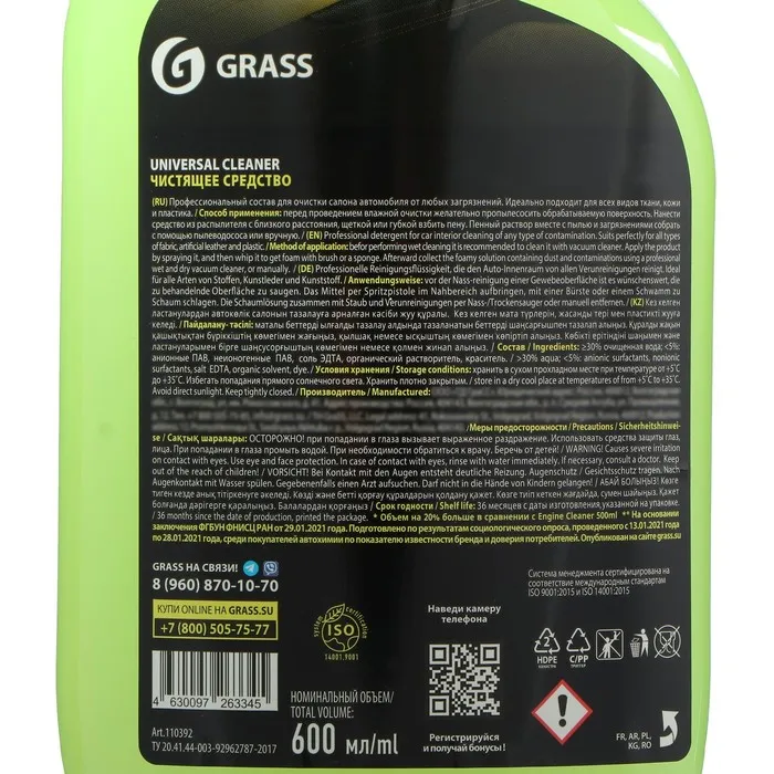 Назначение: Универсальный моющий состав для очистки салона автомобиля от любых загрязнений. Это средство автохимии подходит для чистки ткани, велюра, искусственной кожи, пластика и стекол.