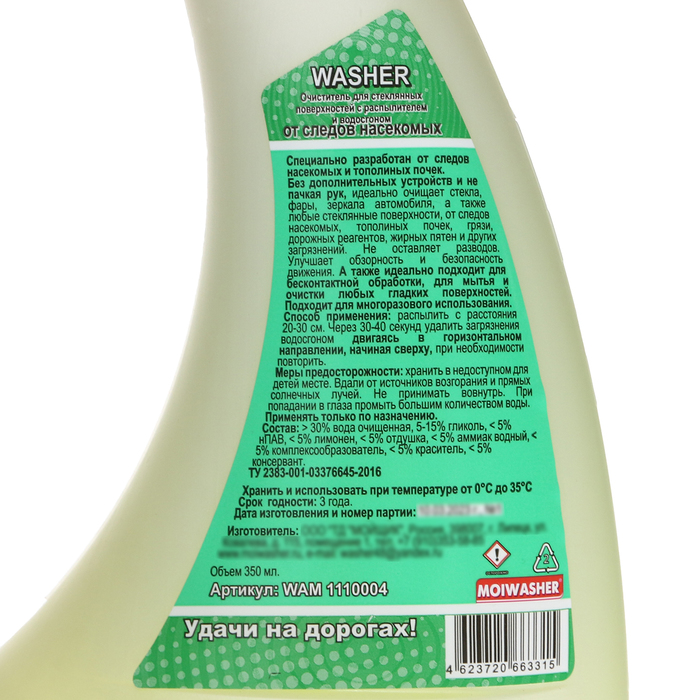 Очиститель стекол автомобиля, с водосгоном Мойщик, от следов насекомых, 350 мл, триггер — Характеристики