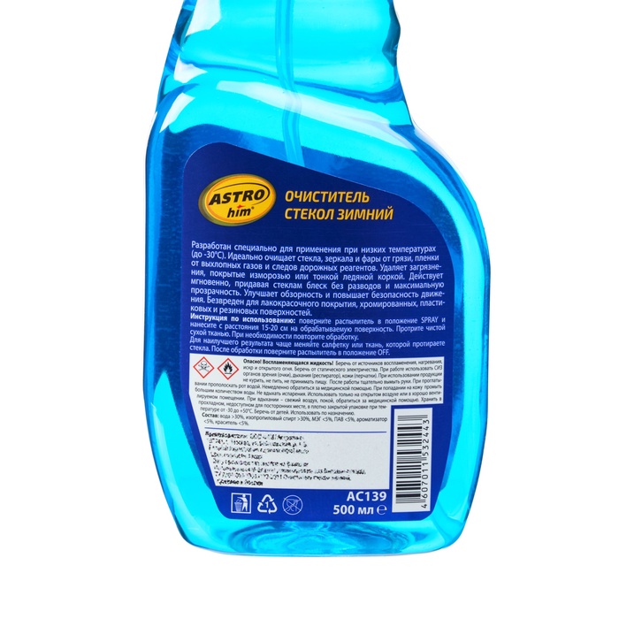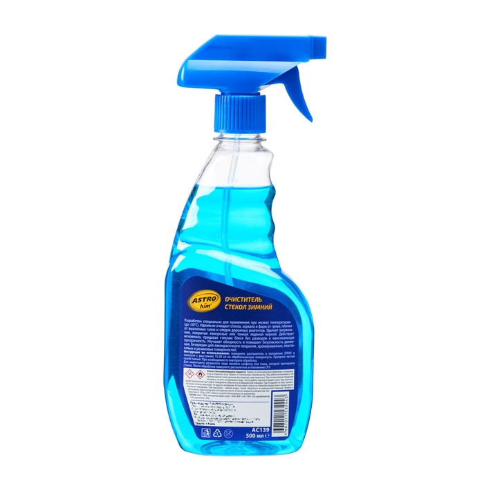 Очиститель стёкол Astrohim, зимний разработан специально для применения при низких температурах (до -30°С). Идеально очищает стекла, зеркала и фары от грязи, пленки от выхлопных газов и следов дорожных реагентов. Удаляет загрязнения покрытые изморозью или тонкой ледяной коркой. Действует мгновенно, придавая стеклам блеск без разводов и максимальную прозрачность. Улучшает обзорность и повышает безопасность движения. Безвреден для лакокрасочного покрытия, хромированных, пластиковых и резиновых поверхностей.