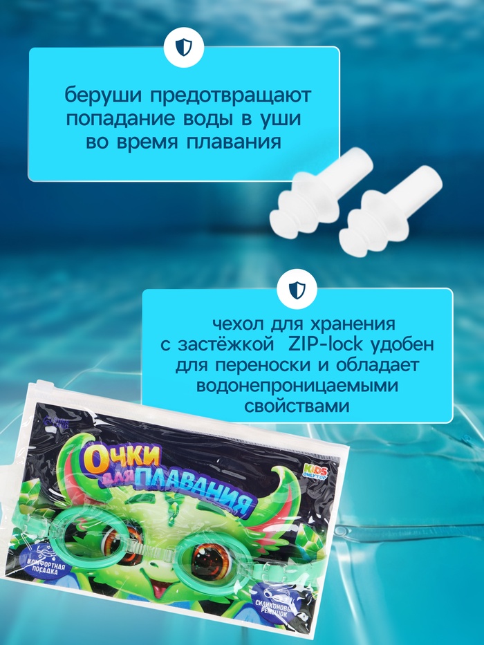 В комплект входят беруши, плотно закрывающие уши во время занятий в бассейне.