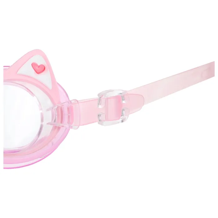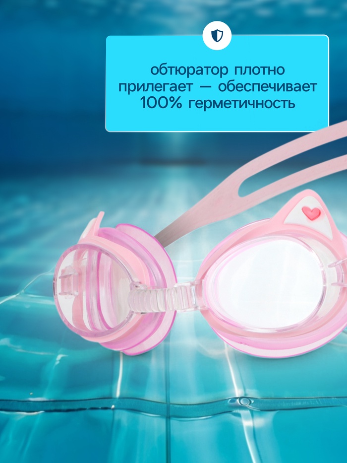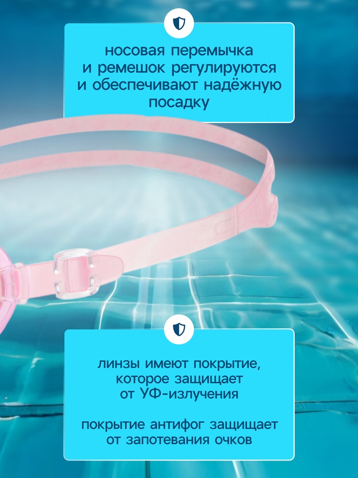 Линзы очков изготовлены из поликарбоната, имеют покрытие от УФ-излучения для защиты глаз ребёнка. Покрытие антифог защищает от запотевания очков. Мягкий и комфортный уплотнитель обеспечивает герметичность во время плавания. Носовая перемычка и ремешок регулируется и обеспечивают надёжную посадку .