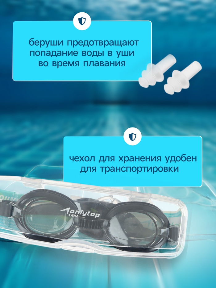 Очки для плавания детские ONLYTOP, беруши, цвет чёрный — Характеристики