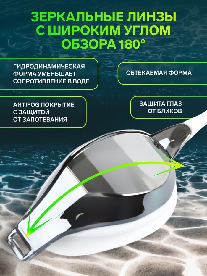 - Зеркальные линзы с широким углом обзора: 180-градусный угол обзора позволяет лучше ориентироваться под водой, а зеркальное покрытие снижает воздействие бликов, что особенно важно при ярком солнечном свете;