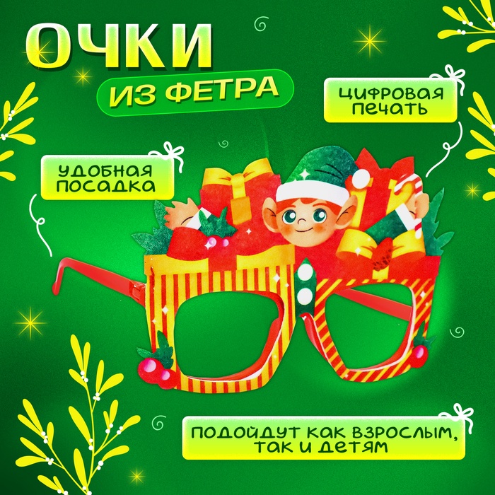 Карнавальный очки «Новогодний подарок» — забавные очки с изображением улыбающегося эльфа, окруженного праздничными подарками, создадут неповторимое праздничное настроение.