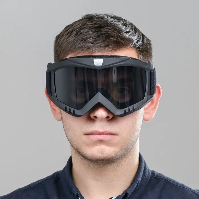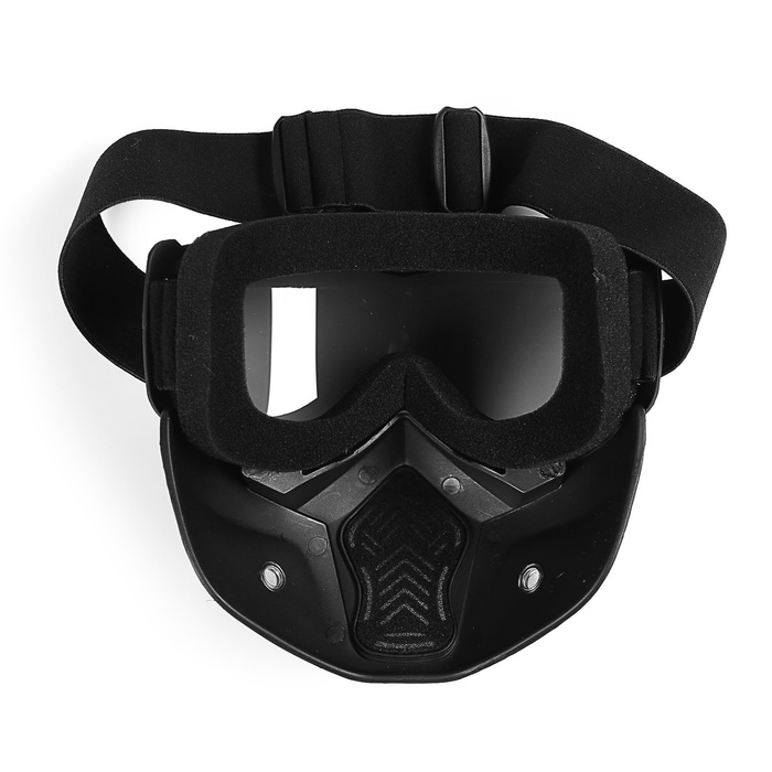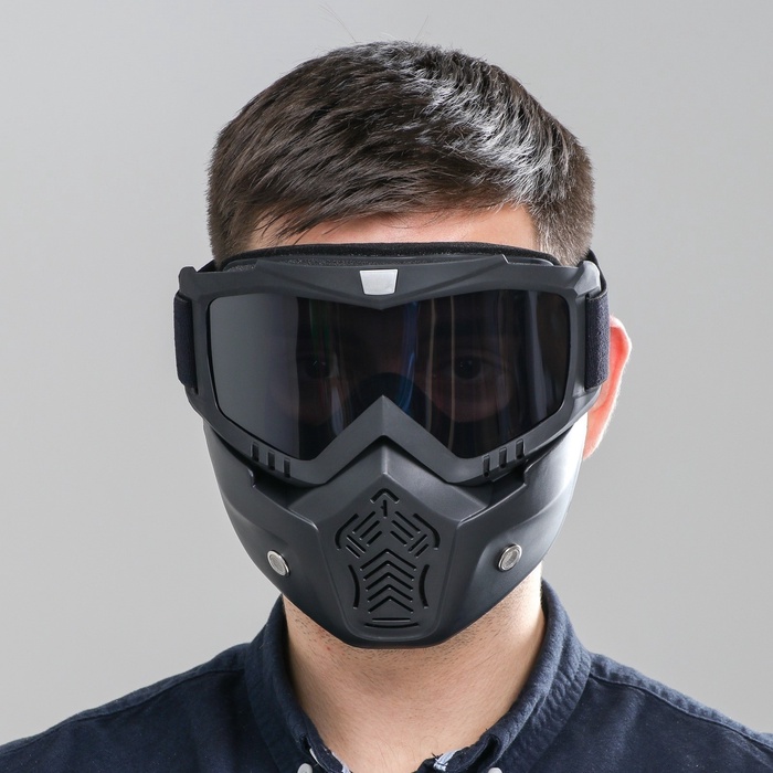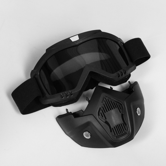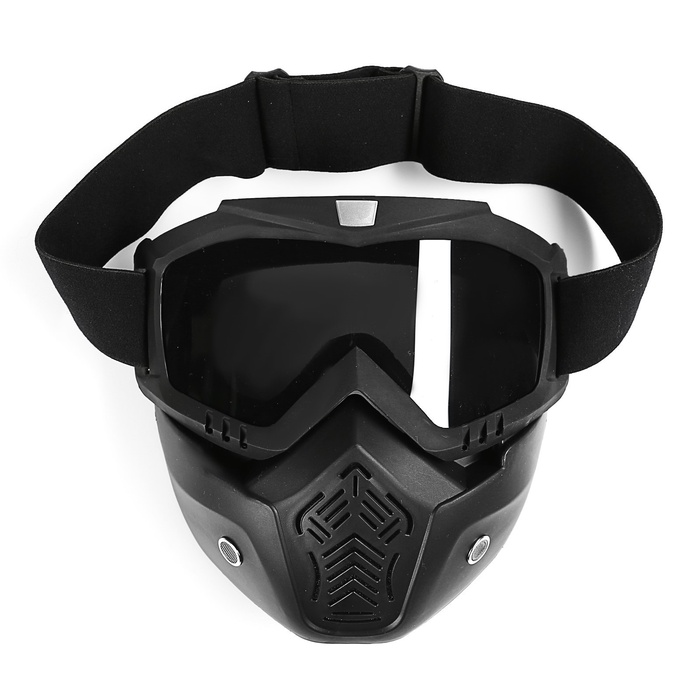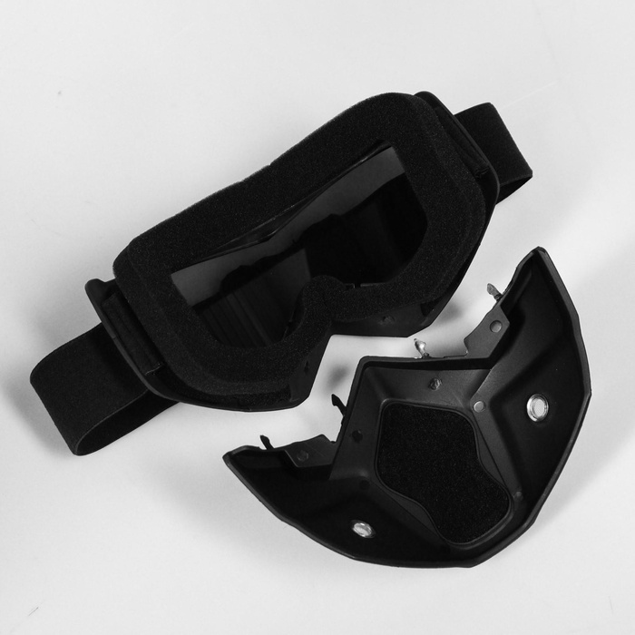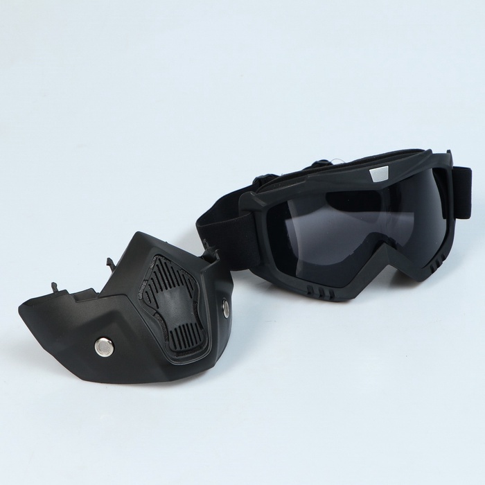 Очки-маска для езды на мототехнике — отличное средство для защиты глаз от пыли/снега/грязи/УФ-лучей. Они плотно прилегают к лицу благодаря поролону и гладкому флису. В районе носа расположен воздушный фильтр, а сверху очков есть отверстия для вентиляции. Нижняя часть крепится на клипсах.
