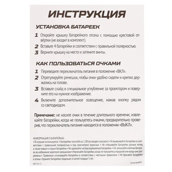 - Для работы очков понадобятся 4 батарейки типа ААА (в комплект не входят).