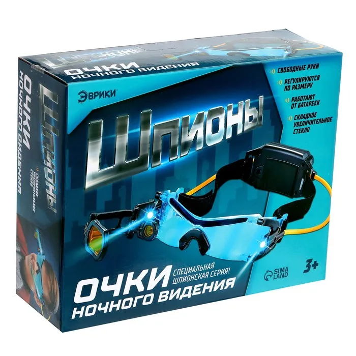 Очки ночного видения — необходимый атрибут для любого шпиона! Эта игрушка способна надолго увлечь ребёнка. У очков есть складное увеличительное стекло с его помощью в темноте можно разглядывать маленькие предметы.