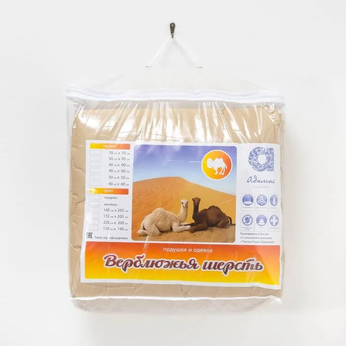 Одеяло Адамас «Верблюжья шерсть», размер 140х205 ± 5 см, 300гр/м2, чехол п/э незаменимо в любое время года. Дело в том, что шерсть верблюда хорошо поглощает и испаряет влагу. Поэтому одеяло прекрасно регулирует температуру тела.