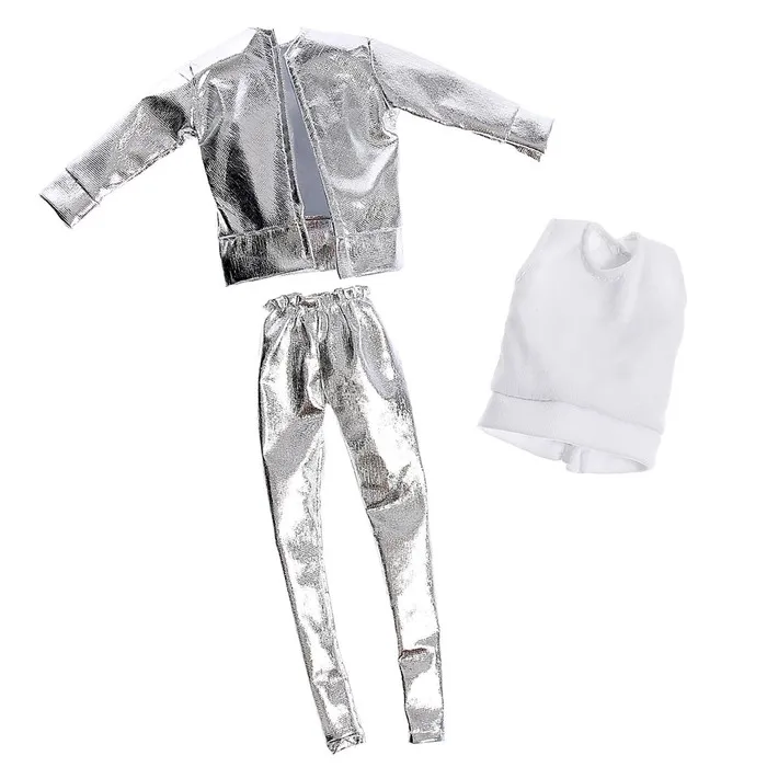 - В наборе серебристый костюм (штаны, куртка), футболка, кеды и стильная сумка.