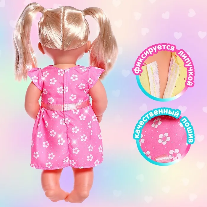 Юная модница любит наряжаться и примерять на своих куколок стильную одежду? С лёгким платьем нежно-розового цвета девочка не станет сомневаться, в чём её игрушечная подружка отправится на прогулку. Актуальный дизайн и качественные материалы порадуют хозяюшку, она примерит наряд на пупса и подберёт для себя костюмчик в тон.
