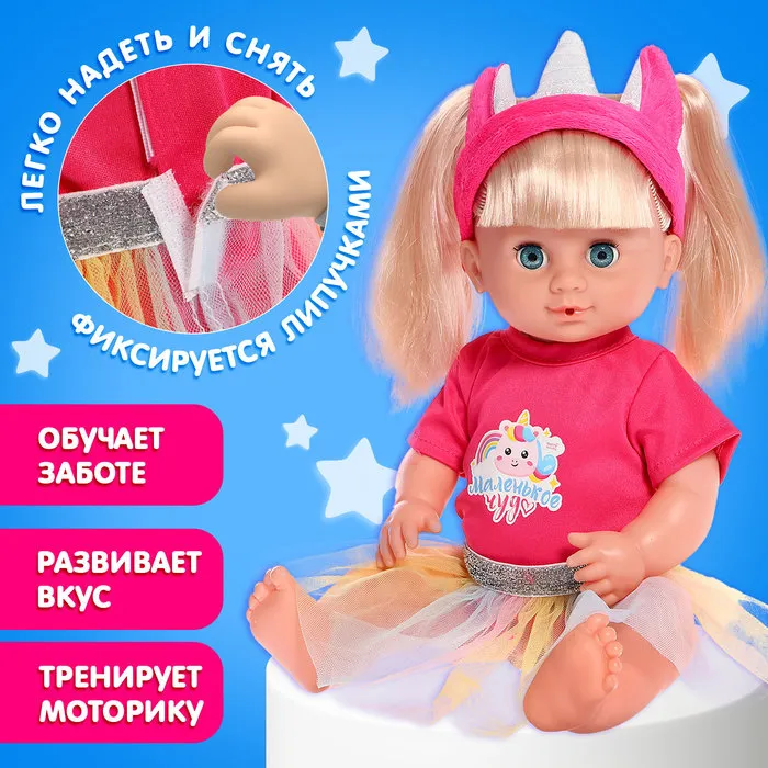 Маленькие леди переодевают любимых пупсиков несколько раз в день. Ведь для разных случаев пупсу нужен соответствующий дресс-код. Одежда для пупсов «Единорожка» — это милый и практичный комплект, включающий боди, юбку и повязку.
