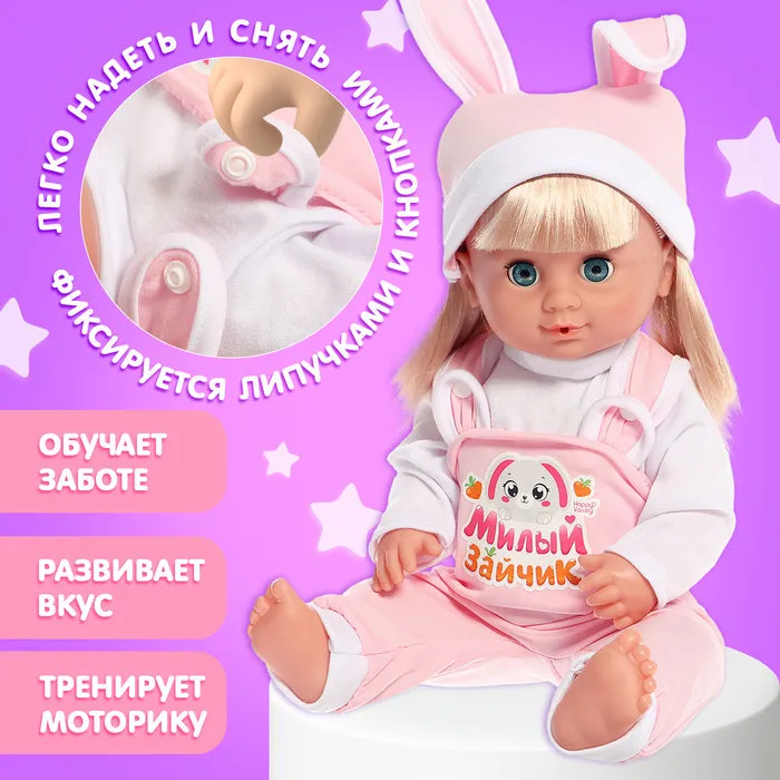 Маленькие леди переодевают любимых пупсиков несколько раз в день. Ведь для разных случаев пупсу нужен соответствующий дресс-код. Одежда для пупсов «Зайчик» — это милый и практичный комплект, включающий кофту, комбинезон и шапочку.