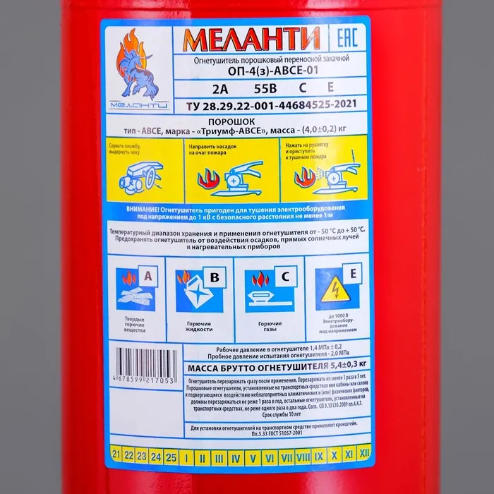 Огнетушитель порошковый ОП-4(з), ABCE — Характеристики