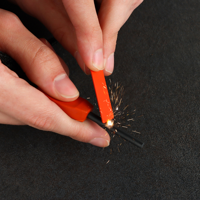 2. Поднесите огниво к труту как можно ближе и сильным движением проведите кресалом по стержню огнива, чтобы создать искры.