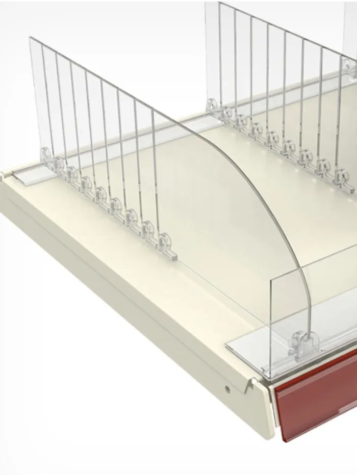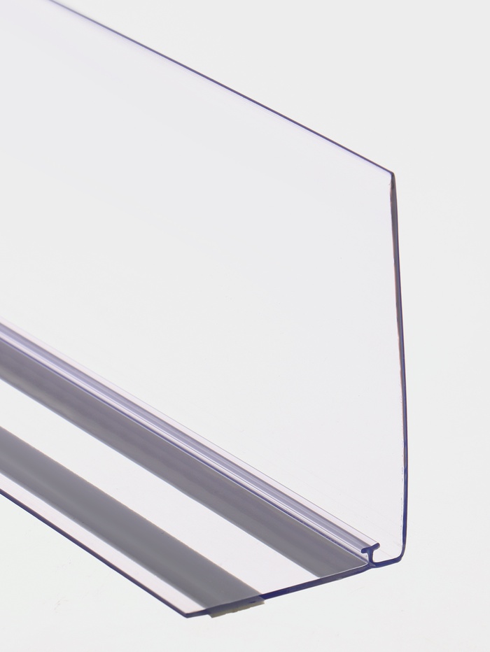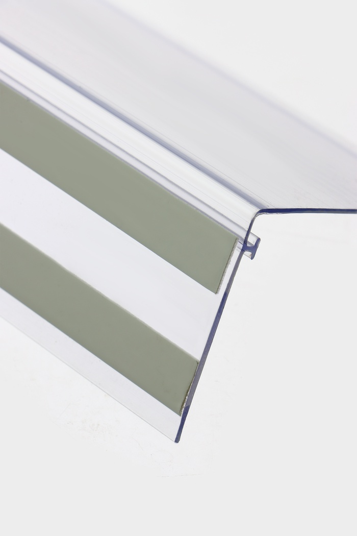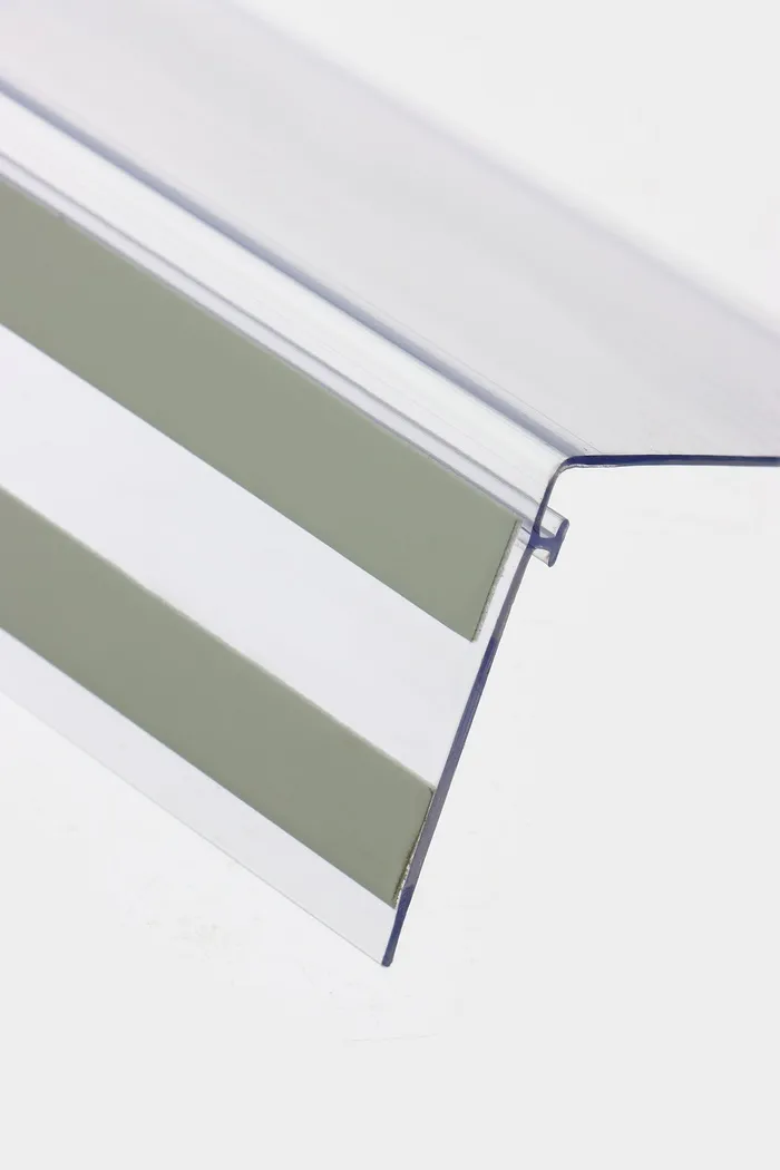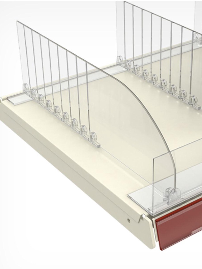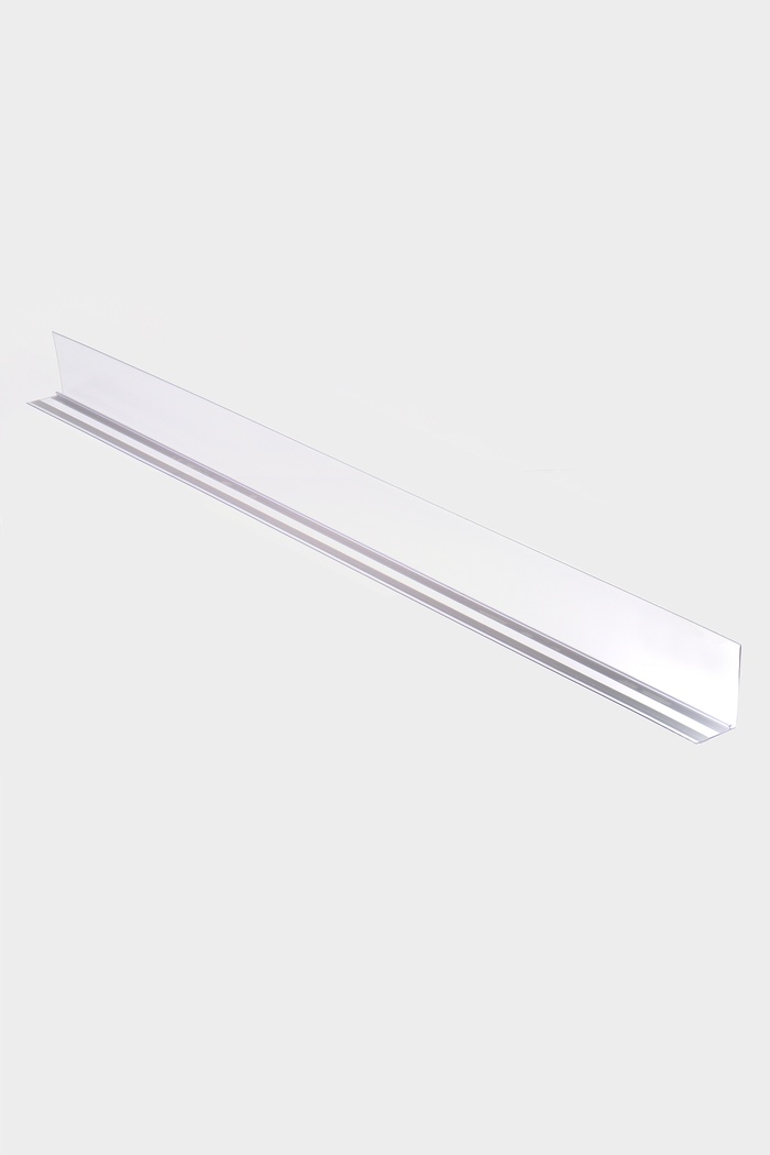 Усиленный L-образный профиль высотой 80 мм, совмещающий в себе передний ограничитель и профиль для крепления разделителей, толкателей, ребристой основы для задней опоры. Ограничитель высотой 80 мм защищает товары от падения с полки. Крепится на двухсторонний скотч.