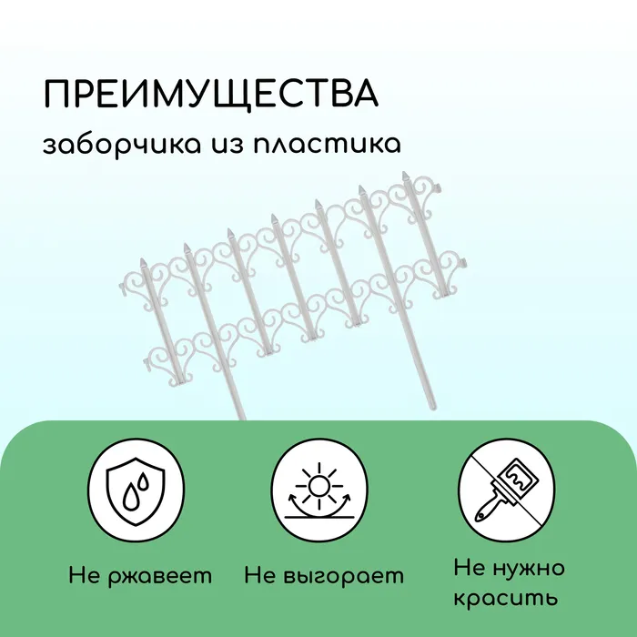 Декоративный заборчик для сада изготовлен из качественного и прочного пластика, который устойчив к воздействиям окружающей среды. Нет необходимости убирать садовый бордюр на зиму. В холодную погоду не подвергайте забор каким-либо воздействиям, так как пластик становится хрупким.