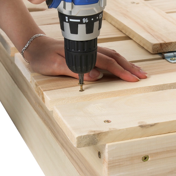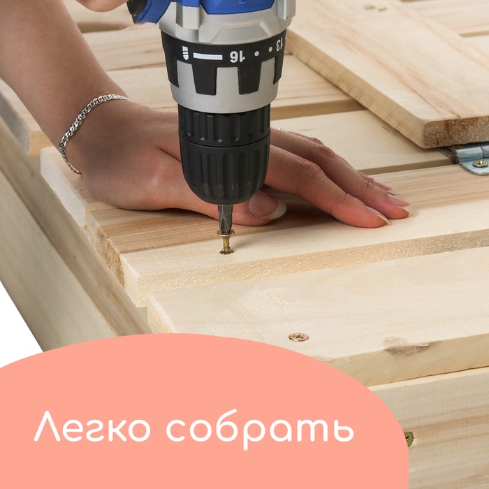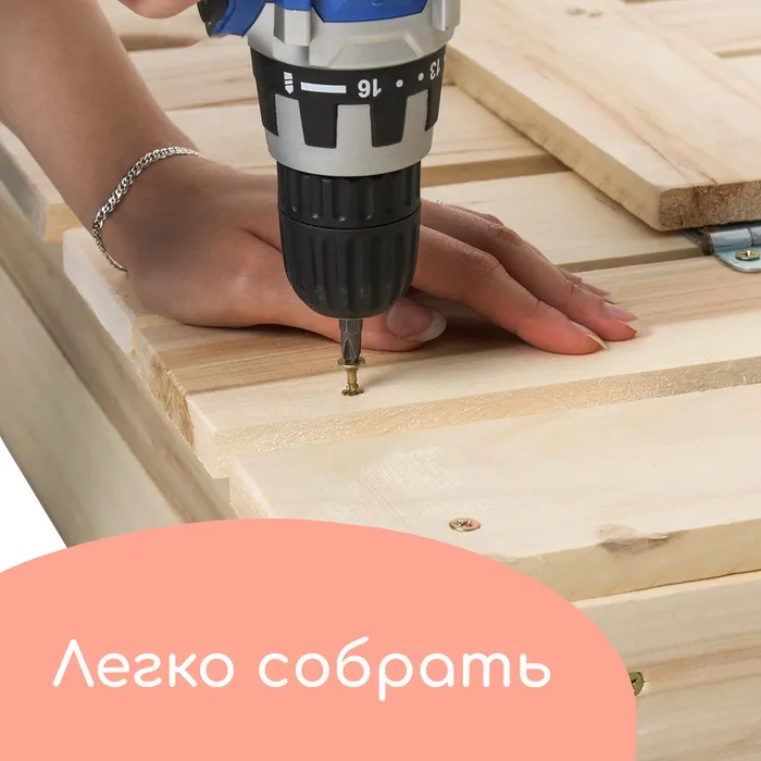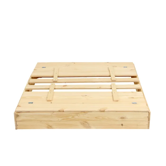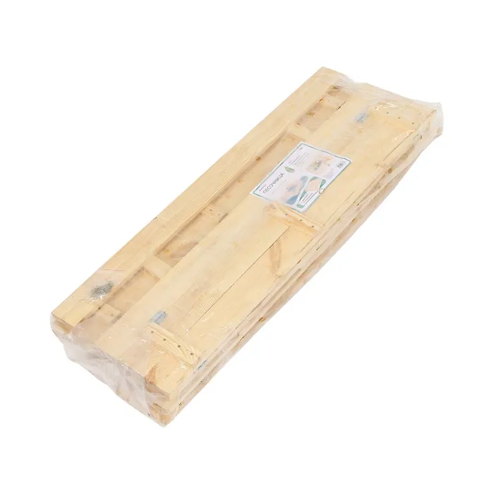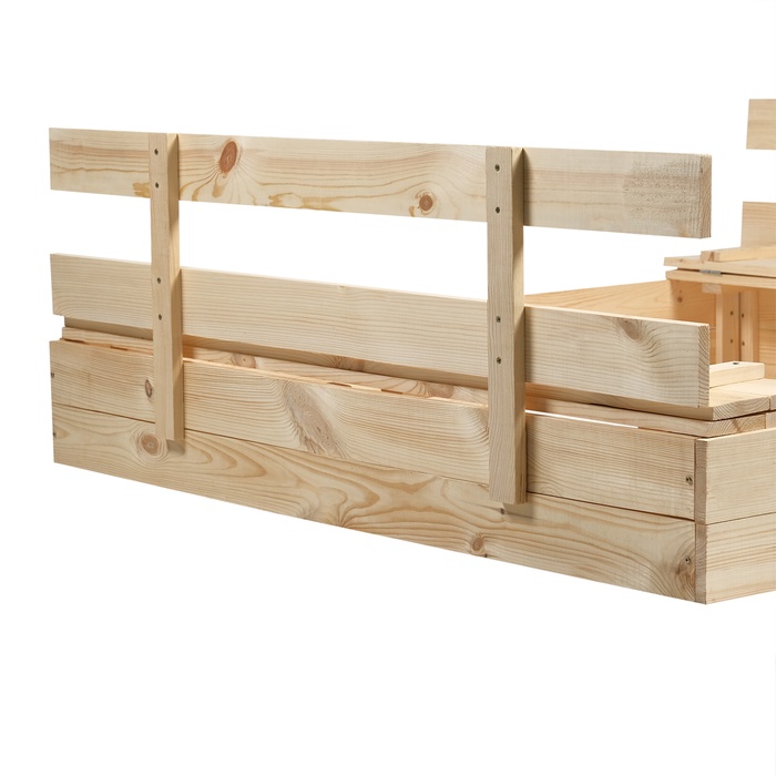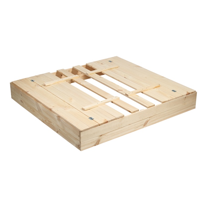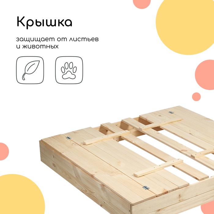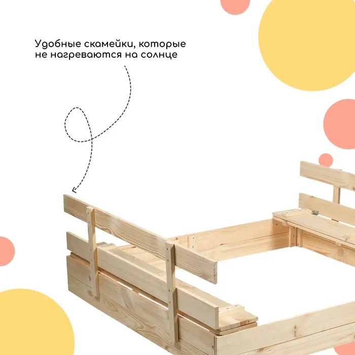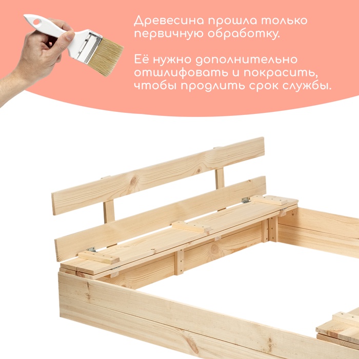- Долгий срок службы. Песочница сделана из сосны, древесина хорошо переносит перепады температур, не разрушится и не испортится на солнце.