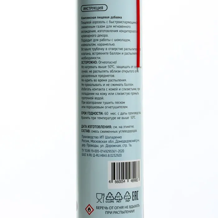 Пищевой аэрозоль с быстро испаряющимся сжиженным газом для мгновенного охлаждения. Подходит для изготовления кондитерского и кулинарного декора.