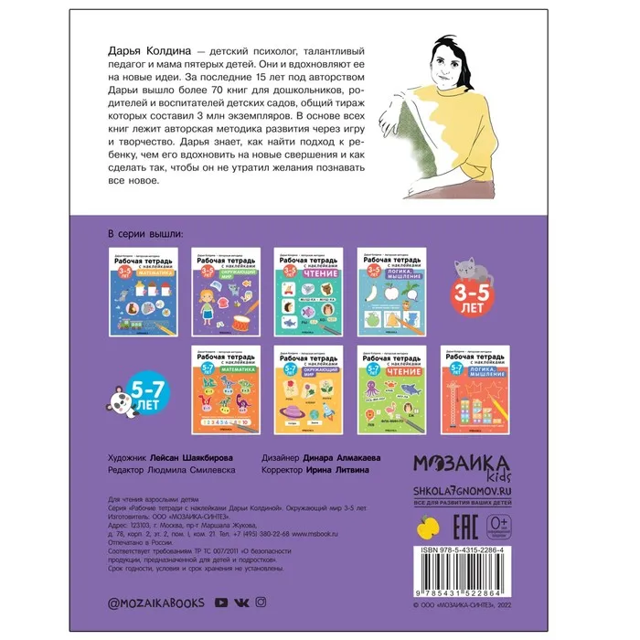 Рабочая тетрадь «Окружающий мир 3-5 лет» из серии «Рабочие тетради с наклейками. Авторская методика Дарьи Колдиной» предназначена для расширения кругозора и знаний об окружающем мире детей от 3 до 5 лет.
