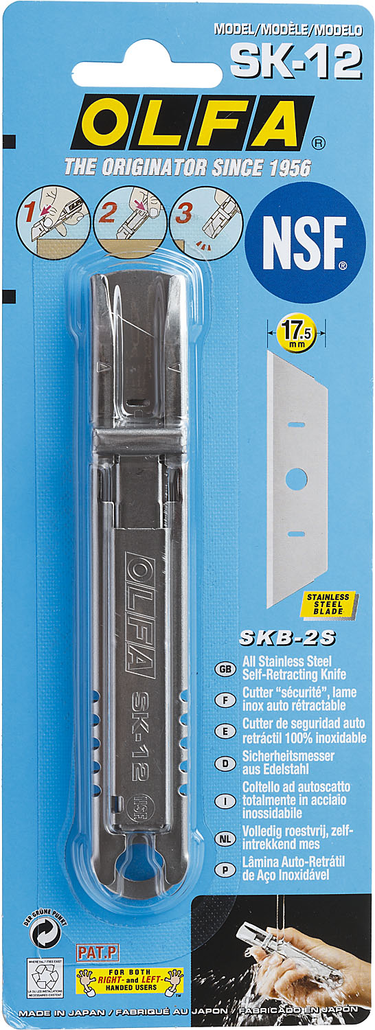 Нож OLFA SK-12 специально разработан для применения в пищевой промышленности и ресторанном бизнесе. Сертифицирован NSF благодаря возможности легко поддерживать его в чистоте любыми методами и составами, в том числе дезинфекция гипохлоритом натрия, за счет конструкции и лезвию SKB-2S из нержавеющей стали. Также, нержавеющая сталь обладает высоким коэффициентом намагничивания, что обеспечивает ножу более высокую точность нахождения металлодетекторами, чем у обычных ножей с пластиковыми рукоятками.