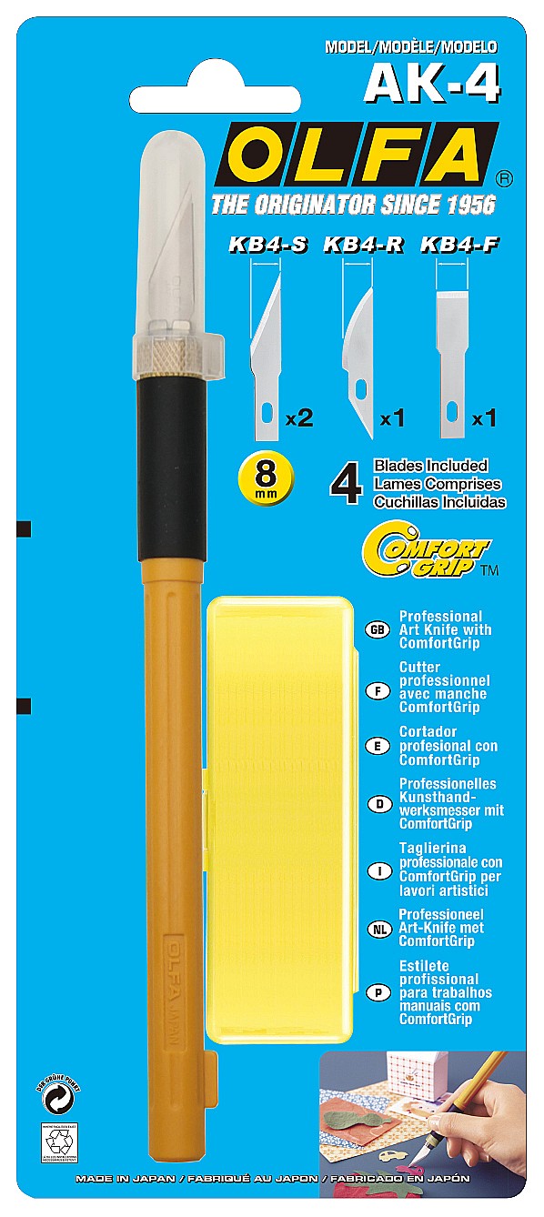 Профессиональный художественный нож OLFA AK-4 с рукояткой ComfortGrip и функцией быстрой смены лезвия обладает идеально продуманным дизайном и устройством стабилизации. Удобно лежит в руке, что обеспечивает наилучшее качество резки. Благодаря дополнительному весу в нижней части и механизму защиты от перекоса Вы можете безопасно и плавно завершить свой художественный проект. В комплект входят два прецизионных лезвия, одно зубило и одно изогнутое резное лезвие. Так что Вам больше не потребуется использовать несколько ножей, достаточно просто установить подходящее лезвие. Используется в мастерских и дизайн-студиях.