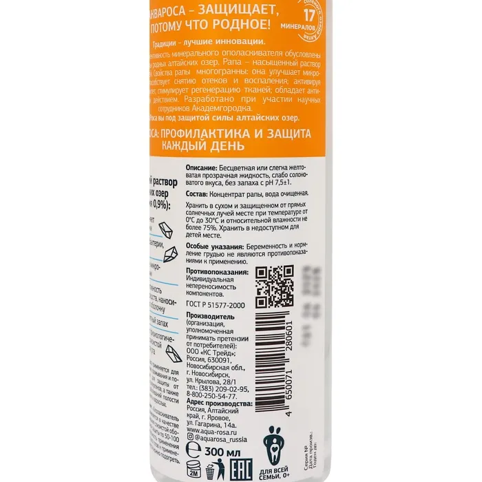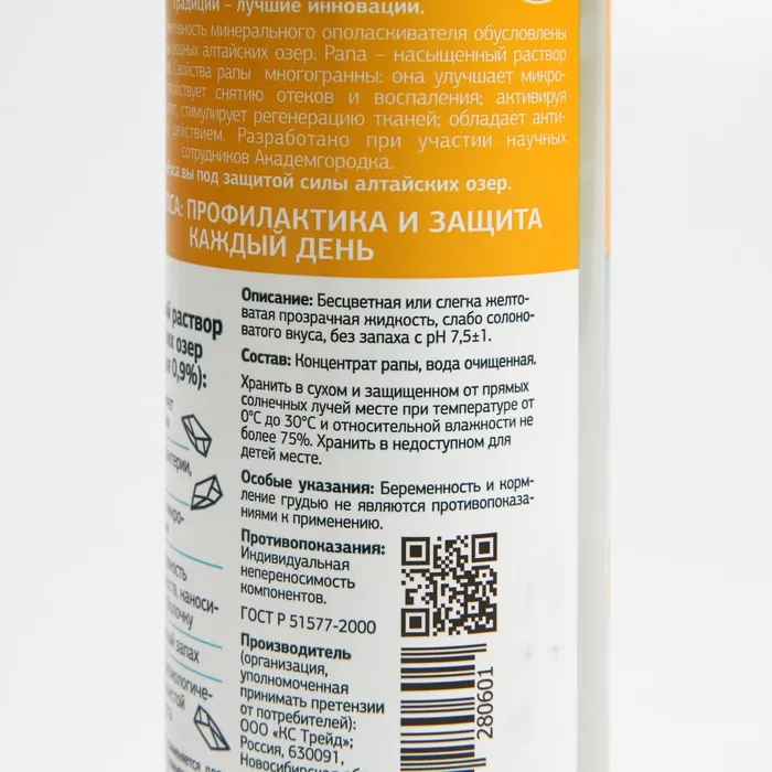 Состав: концентрат рапы, вода очищенная. Рапа — это озерная соль, природный минерально — солевой комплекс, образующийся в экологически чистых соленых озерах Алтайского края. Эффективность рапы доказана. Содержит 17 минералов и биологически активных компонентов (Основные минералы: CL, Na, HCO3, SO4, Mg, K, Ca, Fe, Zn).