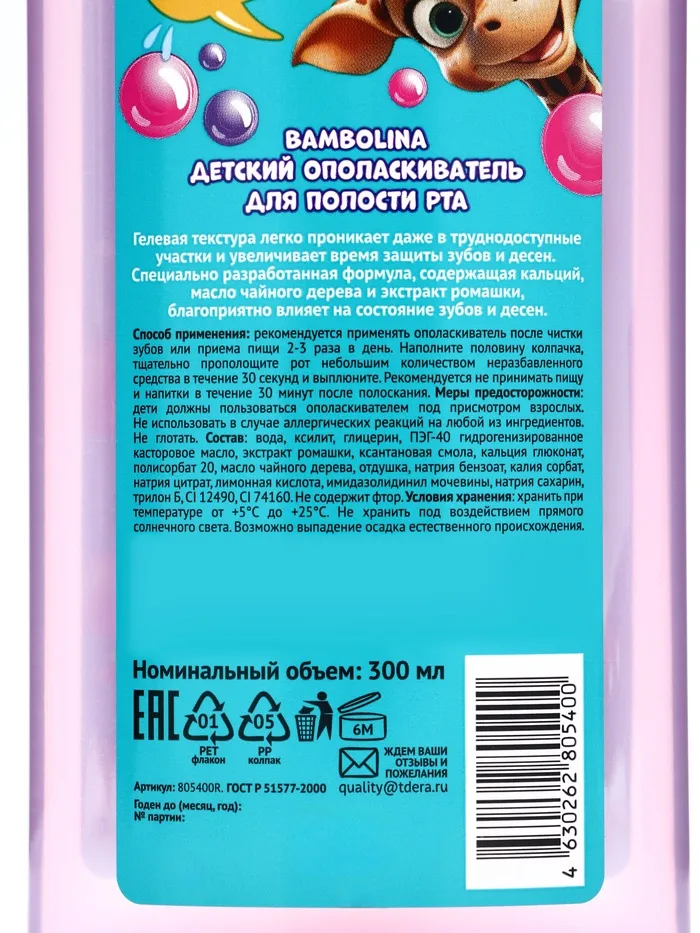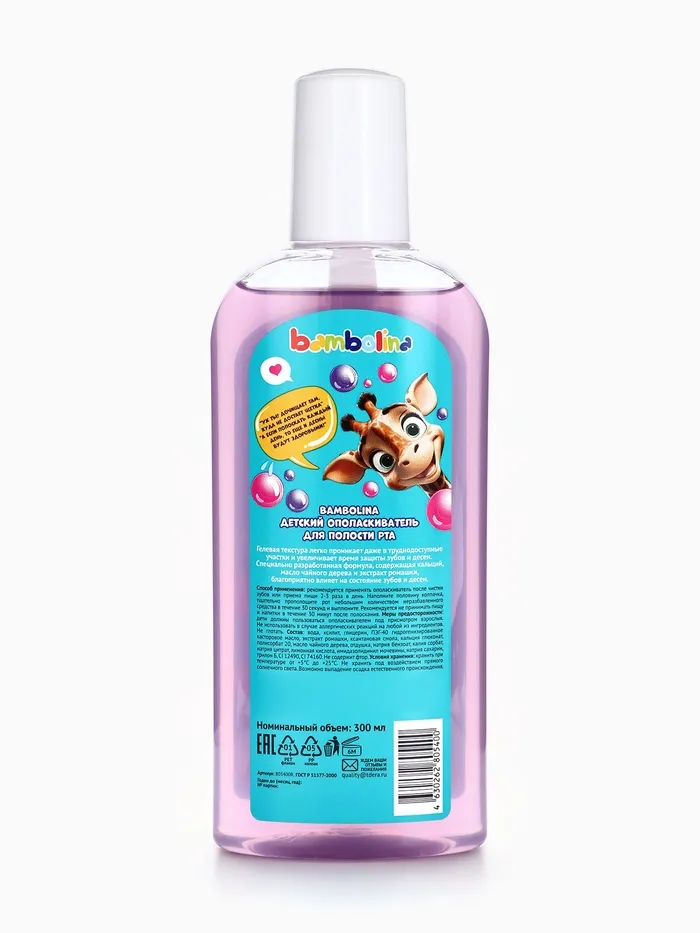Мягкий и безопасный детский ополаскиватель для полости рта Bambolina с ароматом сладкой бабл гам — идеальное средство для ежедневного ухода за зубами и дёснами малышей. Формула разработана с учётом особенностей детской полости рта, бережно очищает, освежает дыхание и защищает от кариеса.