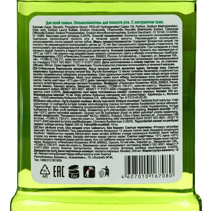 Состав: Aqua, Glycerin, Propylene Glycol, PEG-40 Hydrogenated Castor Oil, Parfum, Sodium Methylparaben, Citric acid, Sodium Lauryl Sulfate, Sodium Hydroxide, Chamomilla Recutita (Matricaria) Extract, Officinalis Extract, Sodium Propylparaben, Sodium Monofluorophosphate, Sodium Saccharin, Cl 19140, CI 42090, CI 15985. Массовая доля фторида 0,003%.
