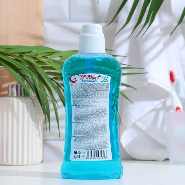 Ополаскиватель для полости рта «Для всей семьи» рекомендован для ежедневного профилактического ухода за дёснами, оказывает противовоспалительное действие, укрепляет их, обладает антисептическим свойством. «Морозная свежесть» придаст дыханию свежий аромат, как после чистки зубов.