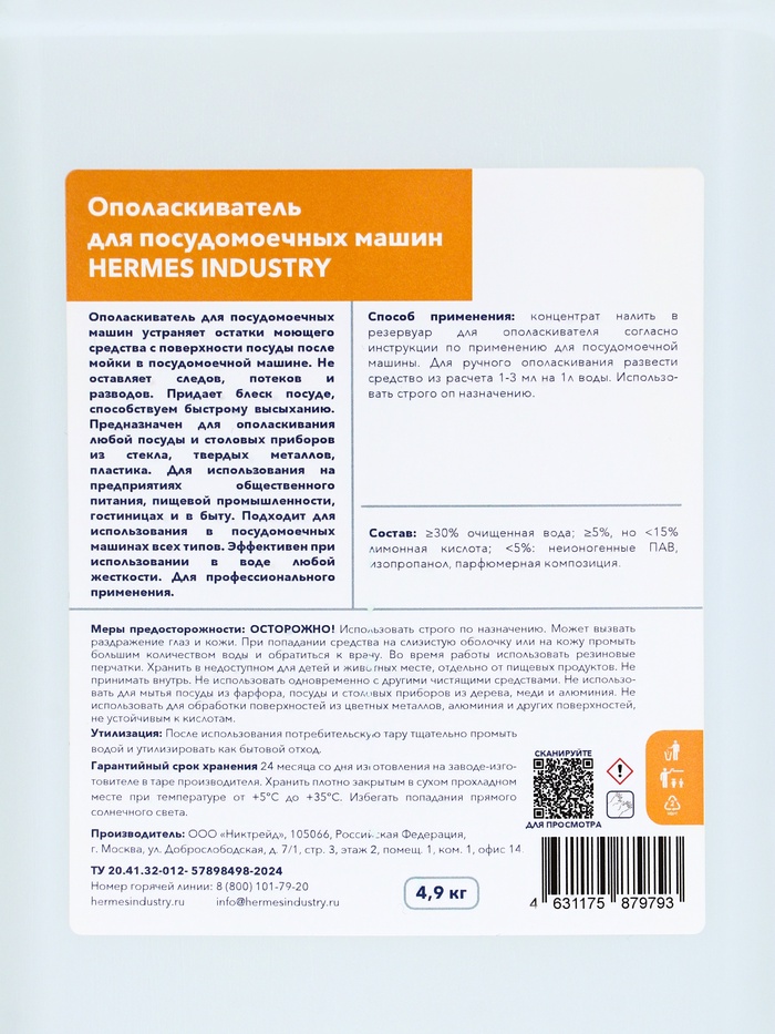 Добейтесь идеальной чистоты и ослепительного блеска посуды с профессиональным ополаскивателем HERMES INDUSTRY Professional HR=01. Это средство нового поколения, специально разработанное для применения в автоматических посудомоечных машинах в условиях повышенной нагрузки — на предприятиях общественного питания, в отелях, столовых, кафе, ресторанах и пищевых производствах.