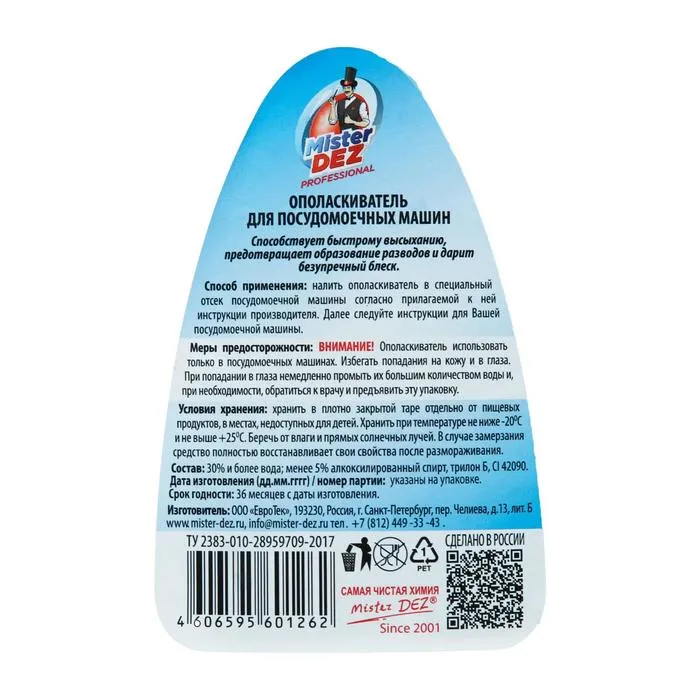 Ополаскиватель для посудомоечной машины Mister Dez эффективно ополаскивает посуду, придает ей блеск, удаляет разводы. Товар сертифицирован.