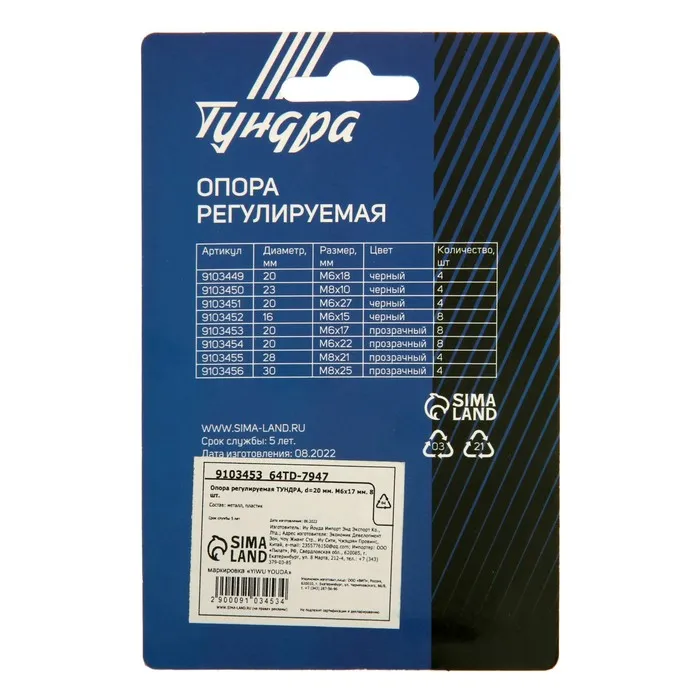 Опора регулируемая ТУНДРА, d=20 мм М6×17 мм 8 шт. — Характеристики