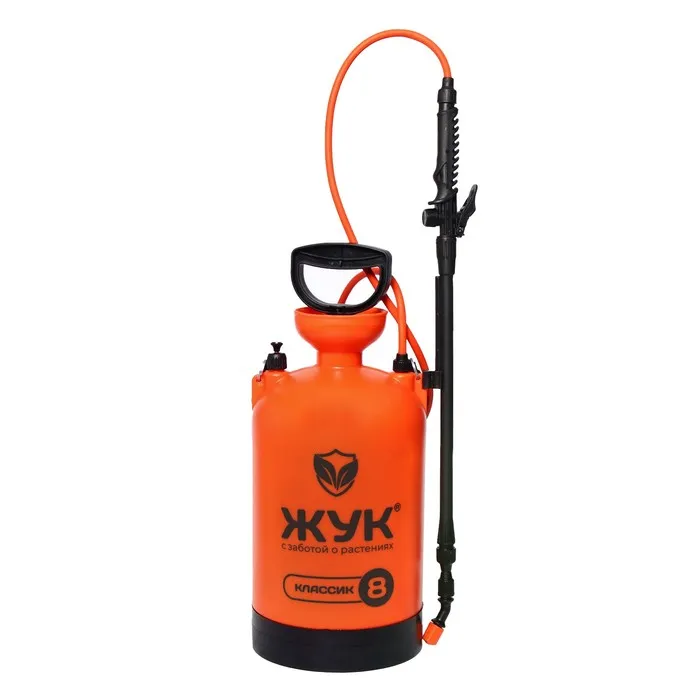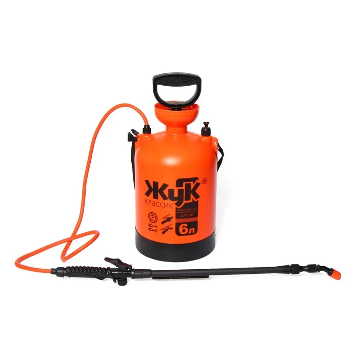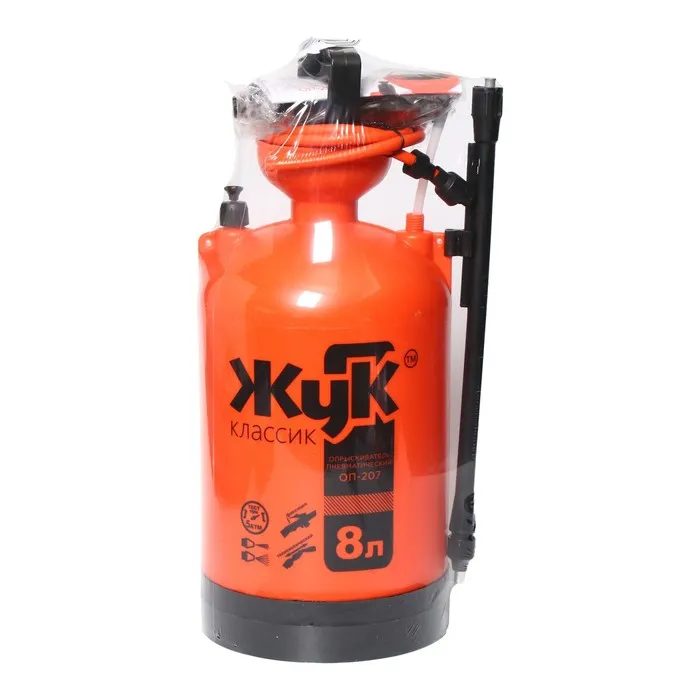 Опрыскиватель ОП-207 «Жук» - наиболее выгодное вложение денежных средств. Мощный и надежный опрыскиватель станет незаменимым помощником при проведении садово-огородных работ, при поливе, при мойке окон или машины. Есть масса вариантов его применения в самых разнообразных ситуациях. Регулировка на брандспойте дает возможность производить полив (плотная струя) и опрыскивание (насыщенный туман). Удобная мерная шкала позволит точно отследить количество залитой и израсходованной жидкости, а специальный предохранительный клапан сработает при повышенном давлении, что обезопасит вашу работу.
