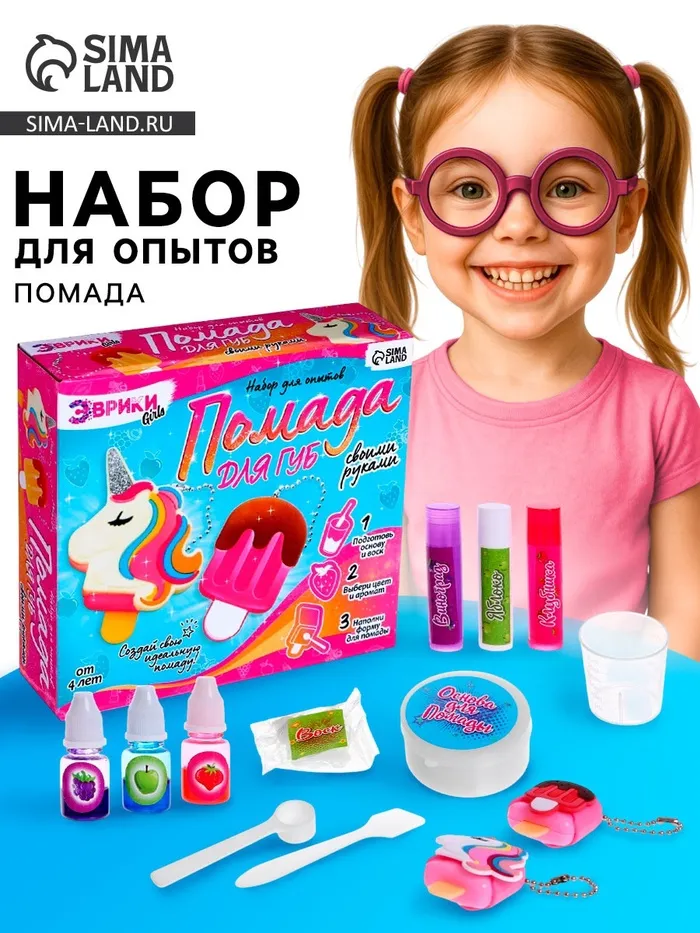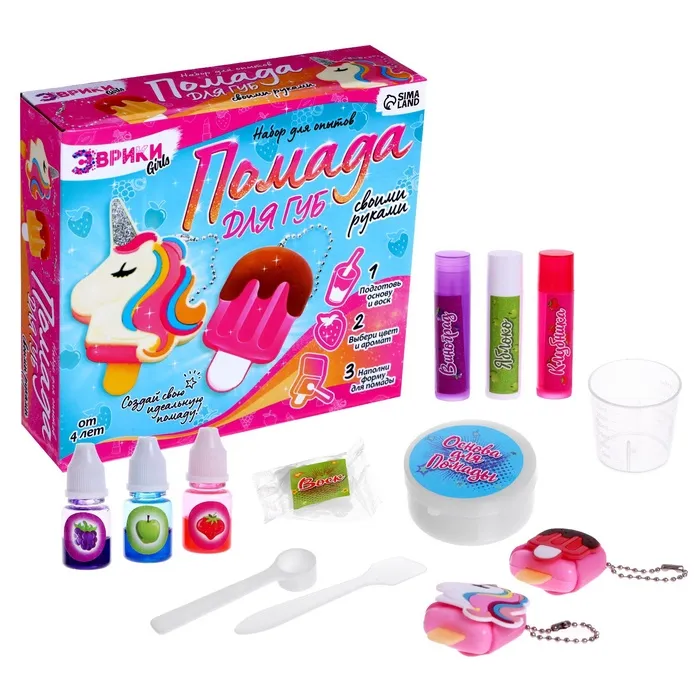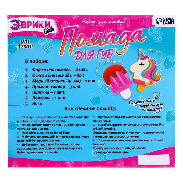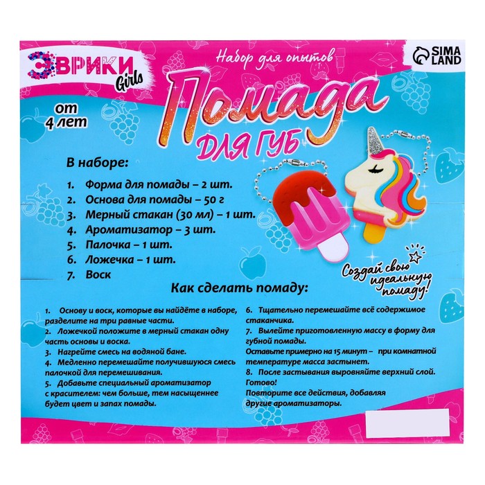 Опыты для девочек «Помада для губ», единорог и мороженка — Характеристики