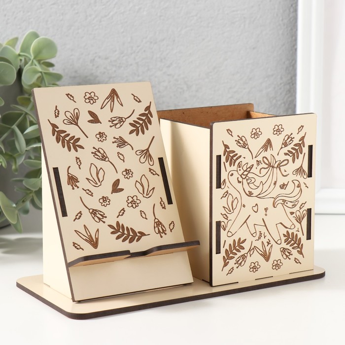 Деревянный органайзер настольный для канцелярии «Единорожка», набор 9 деталей, с подставкой под телефон, карандашница, 18×12.5×9 см