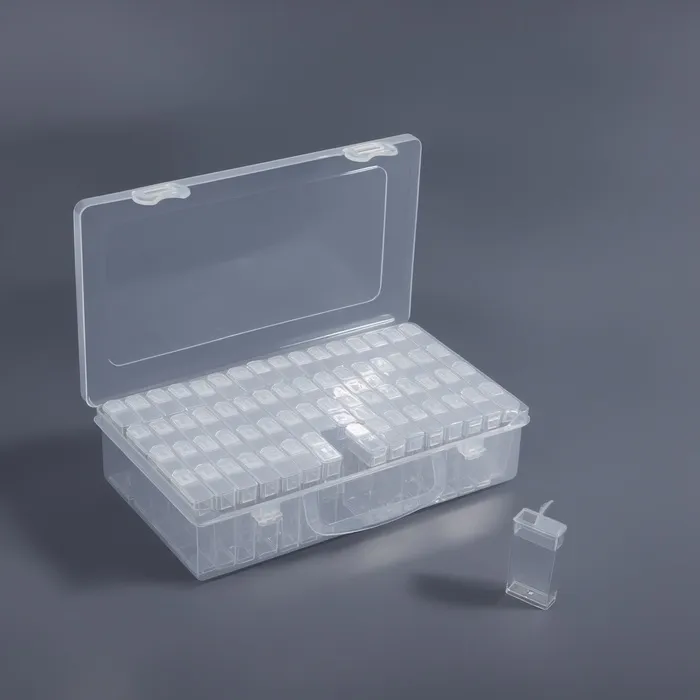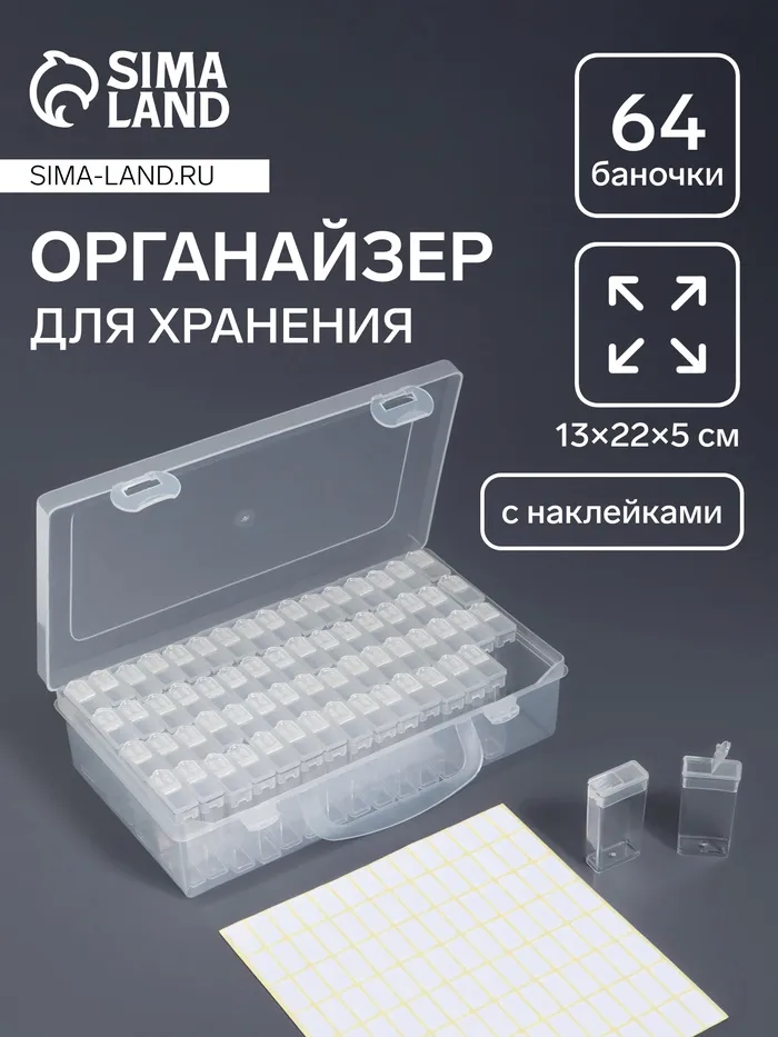- Эффективная организация: 64 отдельные ячейки помогают сортировать материалы по цветам, размерам и видам, что делает процесс декорирования и создания проектов ещё удобнее.