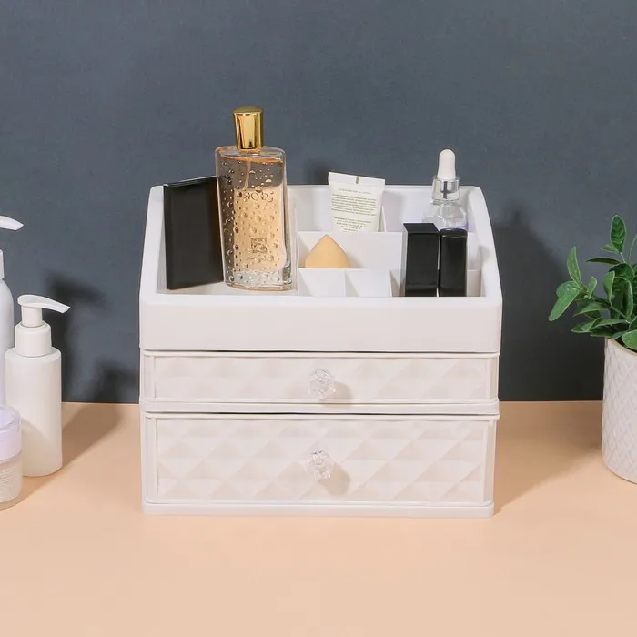 Органайзер соберёт все ваши косметические принадлежности в одном месте и поможет навести порядок. В основном отсеке расположите баночки, тюбики, спонжи и другие средства или предметы. Выдвижные ящики позволяют хранить различный декор, косметику, небольшие аксессуары, ватные палочки и всё, что вам необходимо для ухода за собой. Органайзер станет гармоничным дополнением любого интерьера.